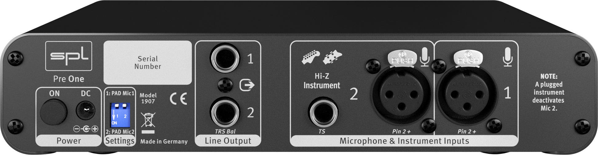 Pre One is equipped with two preamplififiers. These have a discrete design and they are tuned for an open and transparent sound characteristic. In addition to the microphone input, the second preamplififier also features a Hi-Z instrument input – so instruments like electric guitars, for example, can benefit from the sound of the Pre One.